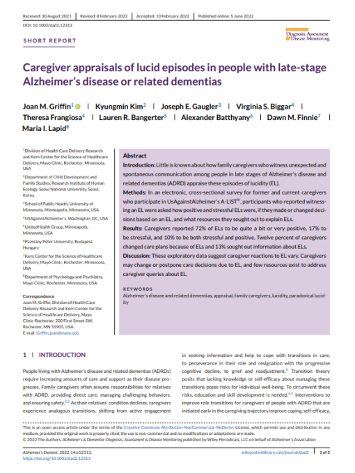 Caregiver appraisals of lucid episodes in people with late-stage Alzheimer's disease or related dementias Read more about Caregiver appraisals of lucid episodes in people with late-stage Alzheimer's disease or related dementias